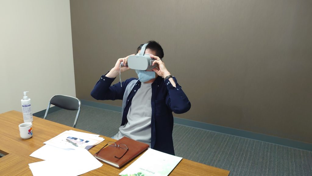 VRゴーグルマスクを目元に当てて、VRゴーグルをつけてバーチャルリアリティーを体験して頂きました。
