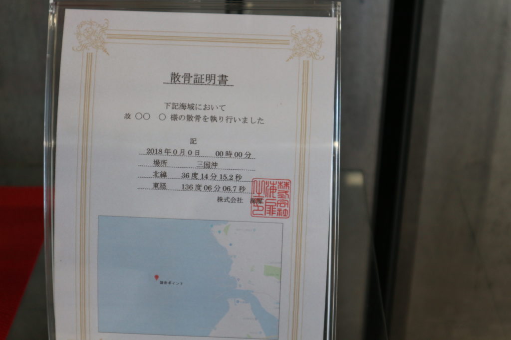 (1)加盟事業者は、遺族から希望があった場合、散骨した場所の緯度・経度を示した散骨証明書を交付しなければいけません。