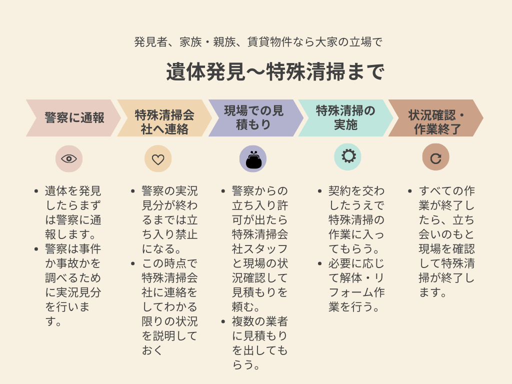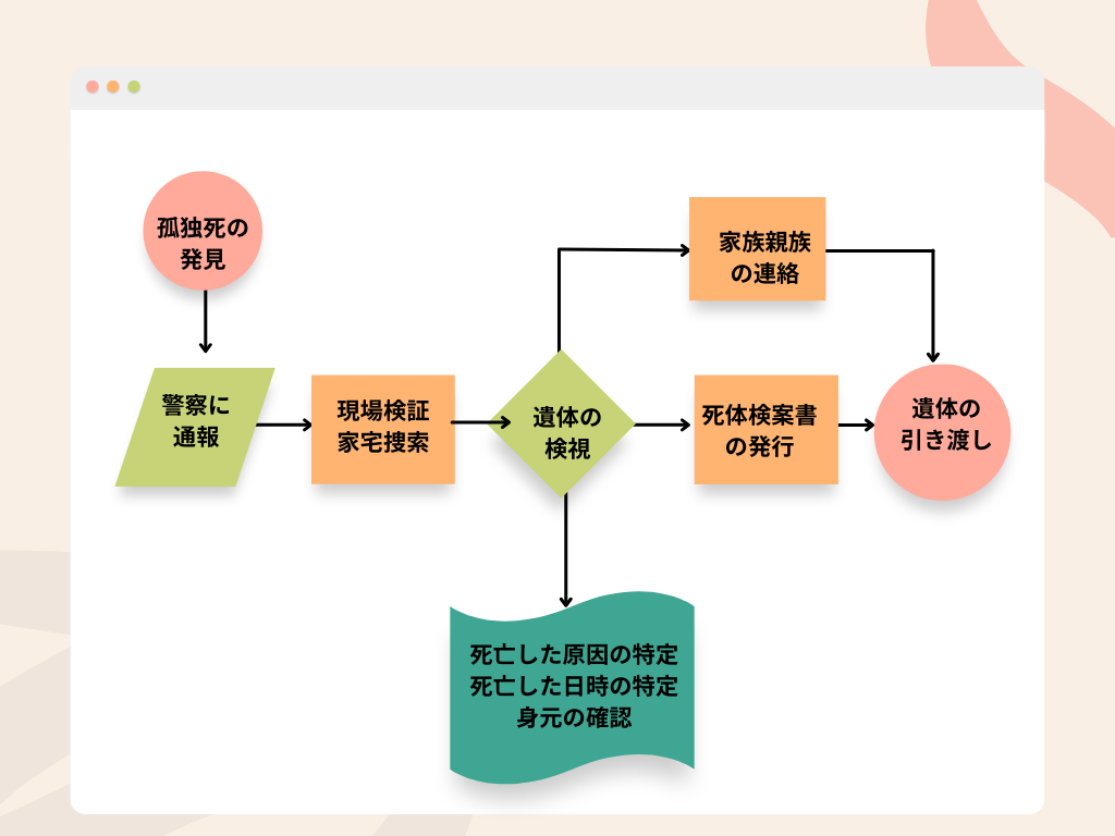 警察や行政の役割、遺体の取り扱い、そして法的な手続き(例:遺産分割)など、ステップごとにわかりやすく説明します。
