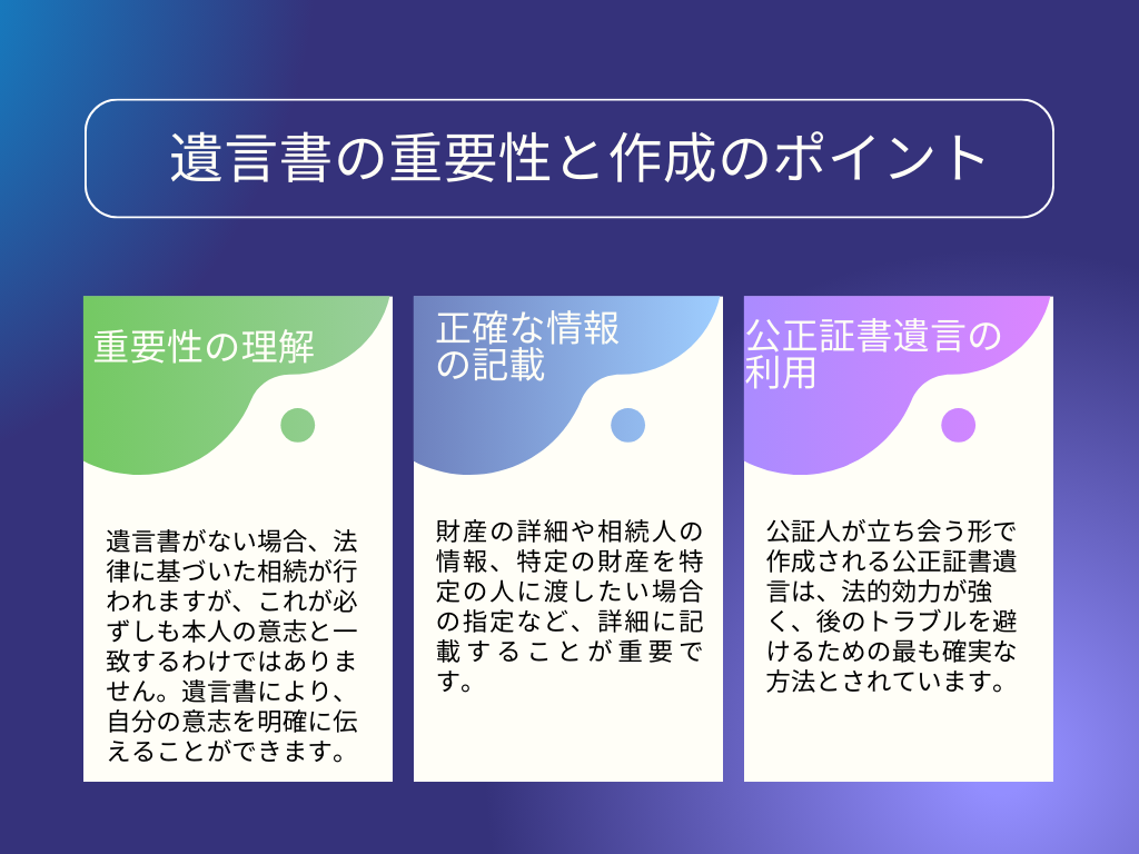 - 方法: 公正証書遺言や自筆証書遺言など、いくつかの方法で遺言書を作成できます。