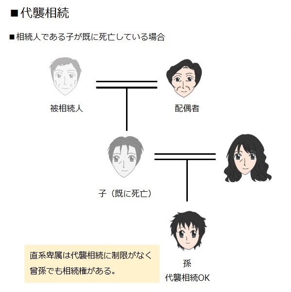被相続人が亡くなった時本来相続人になるはずだったひとが先に亡くなるなどしていた場合にその子や孫やひ孫(直系卑属)が代わって相続人になるという制度