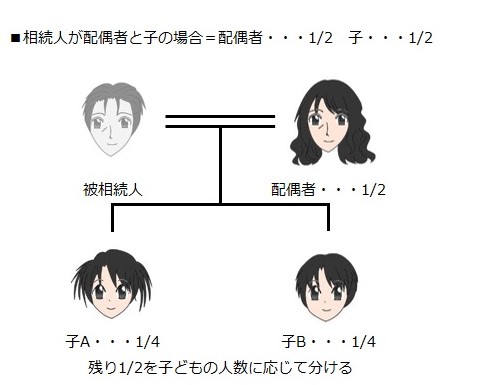 子の相続分及び配偶者の相続分はそれぞれ2分の1である(900条1号)。