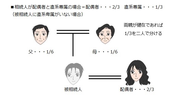 配偶者の相続分が3分の2、直系尊属の相続分が3分の1である(900条2号)。
