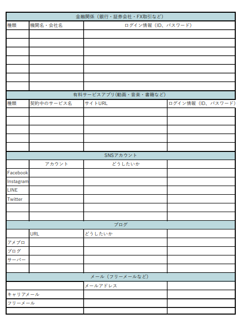 直接パスワードなどを記入するのが嫌な場合は、何らかのヒント(誕生日や記念日、語呂合わせなど)を記入しておくと良いでしょう。