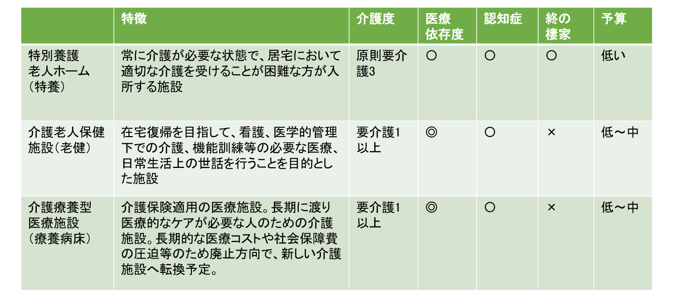 特別養護老人ホーム(特養):要介護3以上の認定を受けた高齢者のためにある公的施設