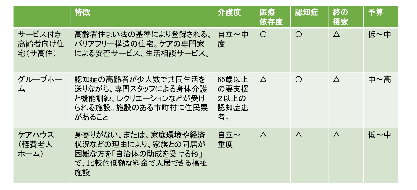 サービス付き高齢者向け住宅:自立できる高齢者(60歳以上)~軽度の要介護者向け、介護サービスは提供しない。別名「サ高住」。同建物内にデイサービス併用必要なら契約をする。