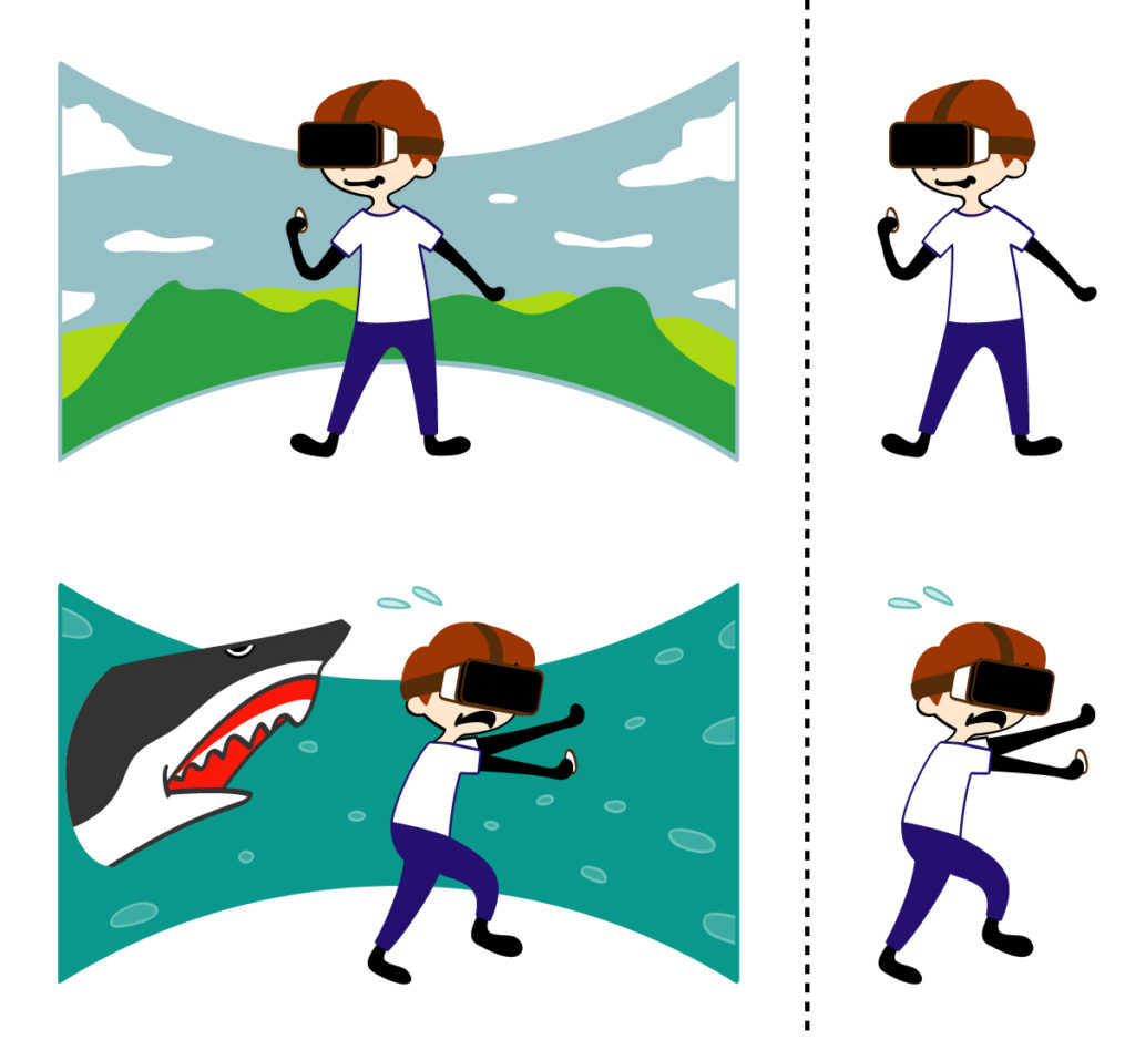 画面のついたVRゴーグルやヘッドホンをつけると視界の360°が覆われ限りなく現実に近い世界に没入する感覚が得られます。